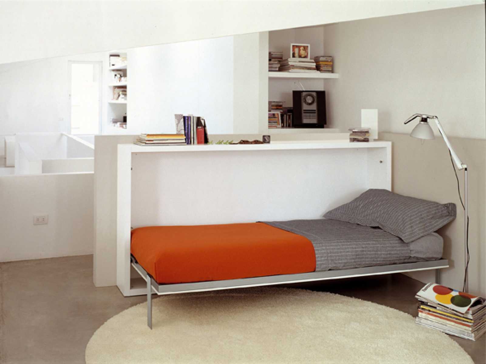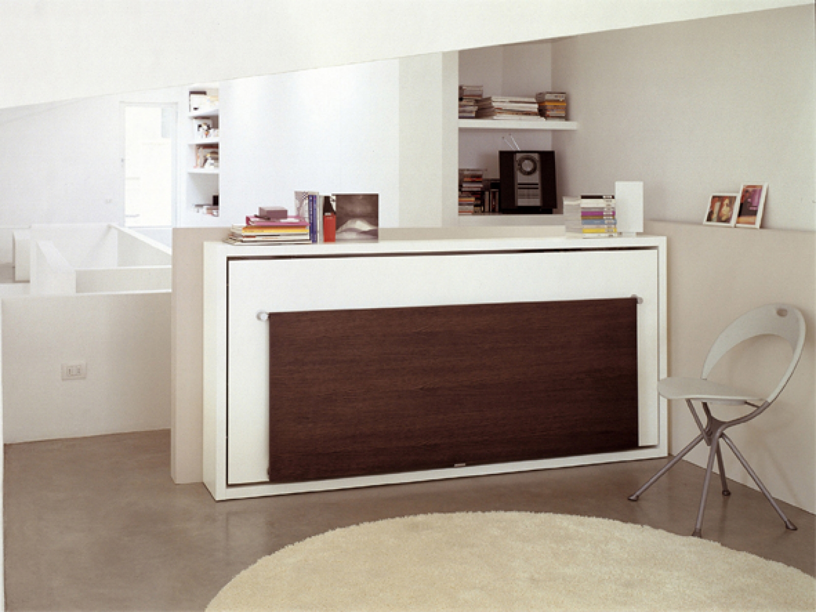 Système de transformation avec un lit simple ou intermédiaire horizontal repliable, un mécanisme d'ouverture rabattable et un bureau à rabat avec pattes pliantes. Le système est également disponible dans les versions sans table (lit simple, Poppi 90 et lit intermédiaire, Poppi 120) et peut être indépendant ou intégré avec des éléments dans les programmes Living & Young System.